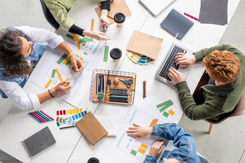 Вид на четырех современных дизайнеров новых мобильных приложений, сидящих за столом