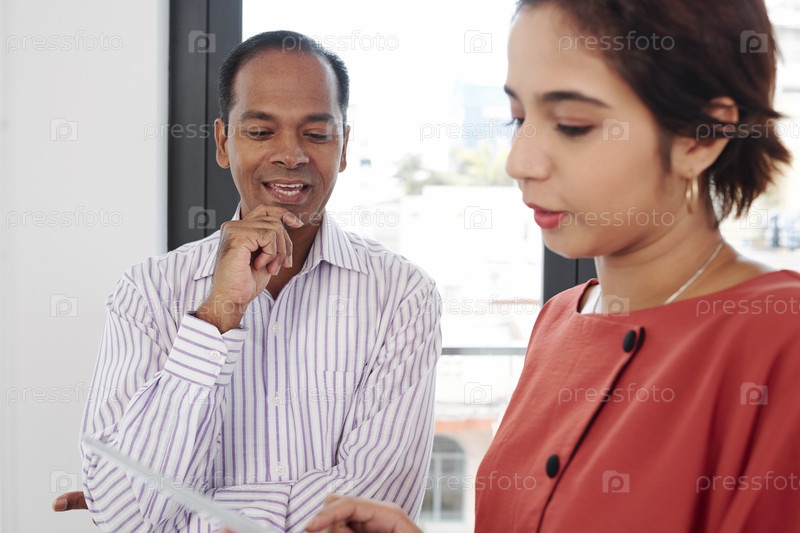 Счастливый бизнесмен смотрит презентацию коллеги