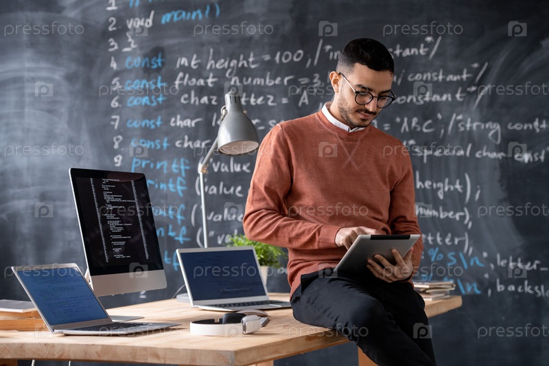 Умный молодой менеджер использует сенсорную панель, сидя за столом с гаджетами