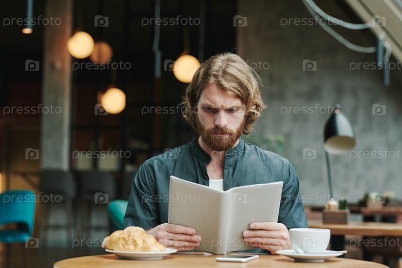 Портрет серьезного современного парня с бородой, сидящего за круглым столом в лофт-кафе и звонившего по мобильному телефону
