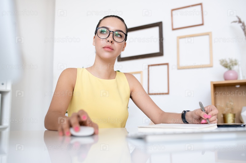 Молодая серьезная женщина-менеджер офиса в желтом платье нажимает на компьютерную мышь