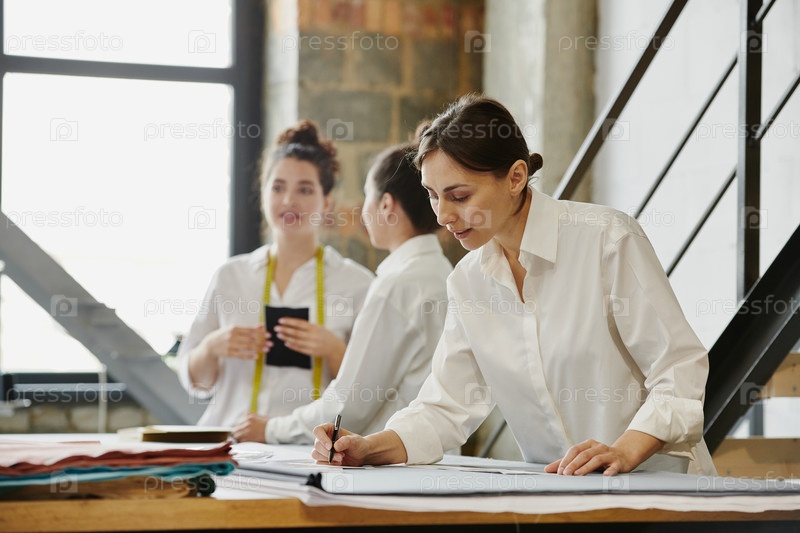 Две молодые женщины-дизайнеры одежды звонят клиентам о заказах в мастерской