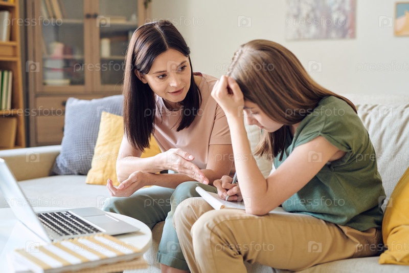 Молодая уверенная женщина в повседневной одежде помогает своей дочери-подростку с домашними заданиями