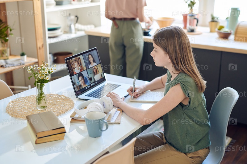 Ученица-подросток смотрит на учителя и нескольких одноклассников на дисплее ноутбука