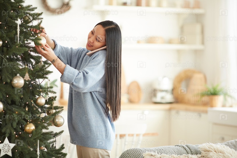Женщина украшает рождественскую елку