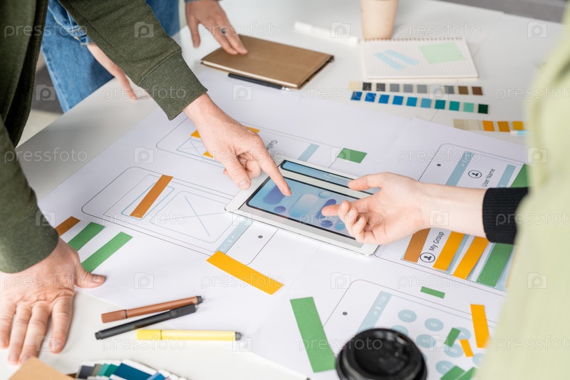 Руки молодых современных разработчиков программного обеспечения, указывающих на дисплей планшета