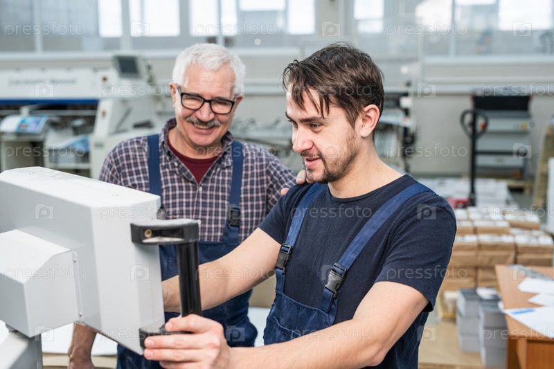 Молодой стажер типографического завода, работающий с машинами
