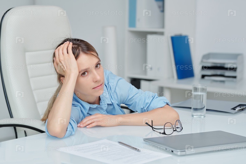 Уставшая и скучающая красивая молодая бизнес-леди, сидящая в кресле у стола в офисе