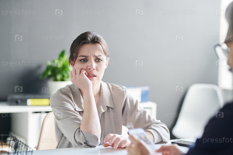 Молодая нервная соискательница, смотрящая на свое резюме в руках работодателя