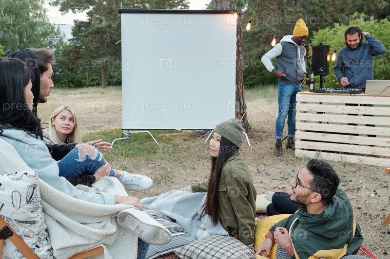 Две молодые межкультурные пары в повседневной одежде отдыхают на подушках на свежем воздухе