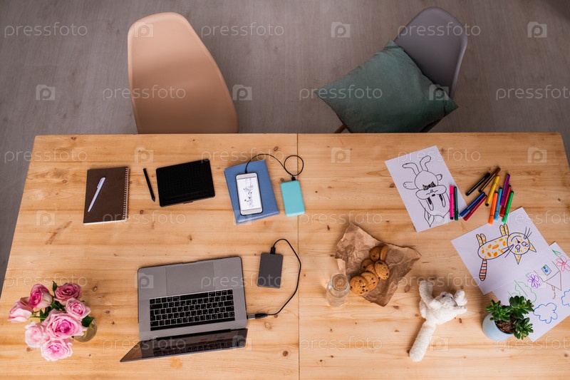 Вид сверху деревянного стола с гаджетами, блокнотом со стилусом, ноутбуками и т. Д