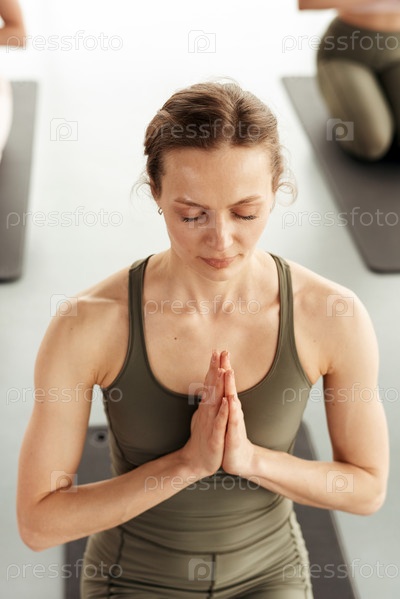 Спокойная женщина медитирует на уроке йоги
