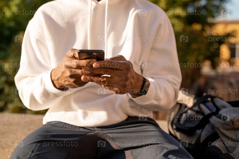 Молодой спортсмен со спортивной сумкой на плече, идущий по плиточной тротуару