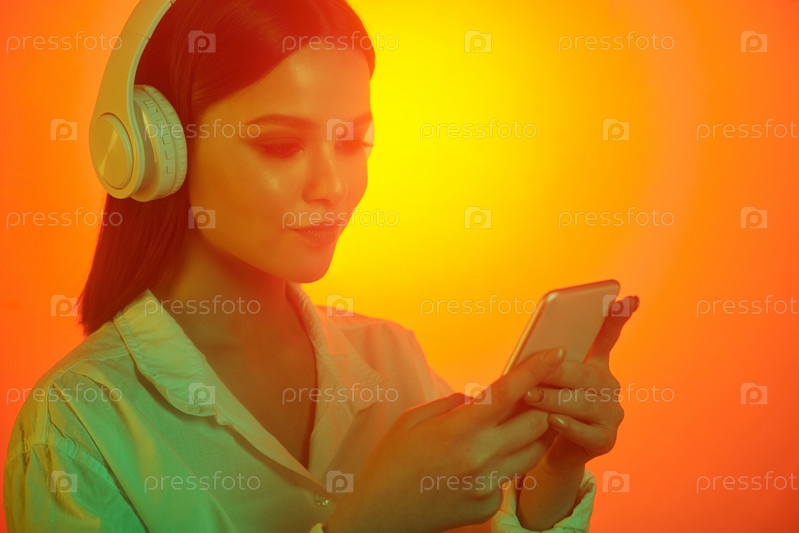 Милая девушка слушает музыку в наушниках, глядя на дисплей смартфона