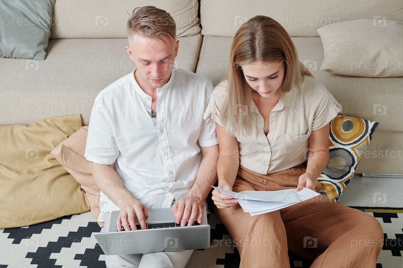 Молодые женатые деловые партнеры, вводящие данные и читающие страницы контракта
