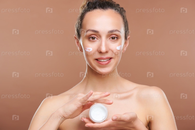 Молодая красивая женщина держит банку с увлажняющим кремом для лица в руках