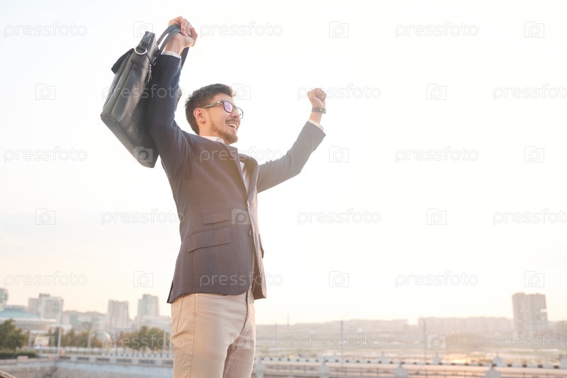 Молодой взволнованный бизнесмен с черной кожаной сумочкой, выражающей триумф