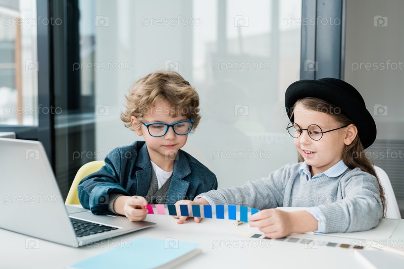 Два дружеских школьника в повседневной одежде выбирают цвет из сwatch по столу