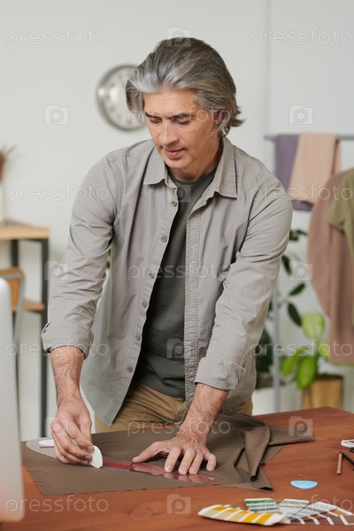 Опытный зрелый мужской портной с седыми волосами стоит за деревянным столом в ателье и рисует узоры на ткани, используя мел