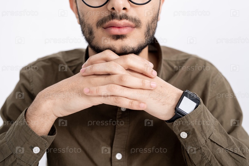 Нижняя часть лица и скрещенные пальцы молодого спокойного бородатого мужчины в рубашке