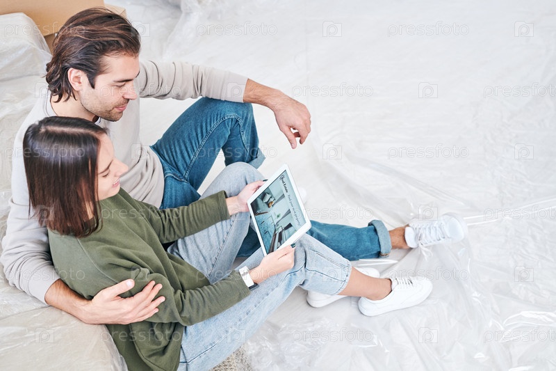 Муж и жена с сенсорным панелем смотрят в Интернете идеи нового планирования квартиры