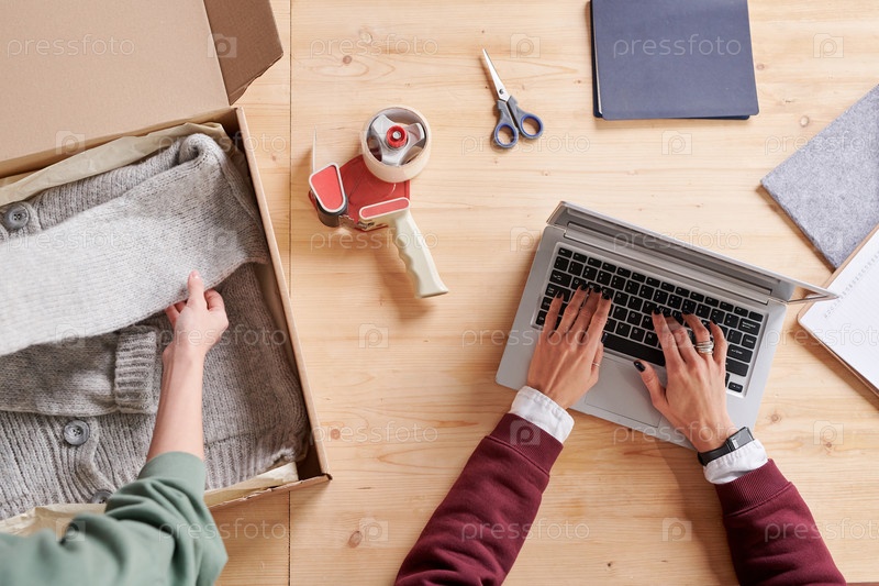 Вид сверху неузнаваемой женщины, упаковывающей ручной кардиган в коробку для отправки, пока ее коллега печатает на ноутбуке