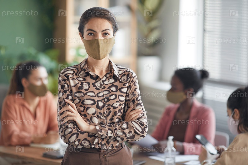Портрет уверенной деловой женщины, носящей маску
