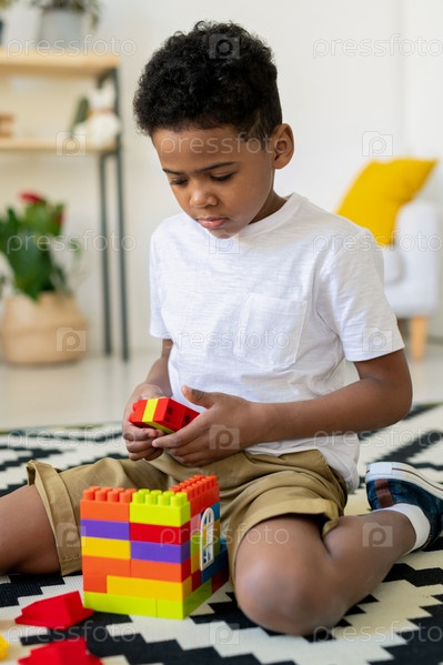 Милая африканская дошкольница в повседневной одежде играет на полу в детском саду