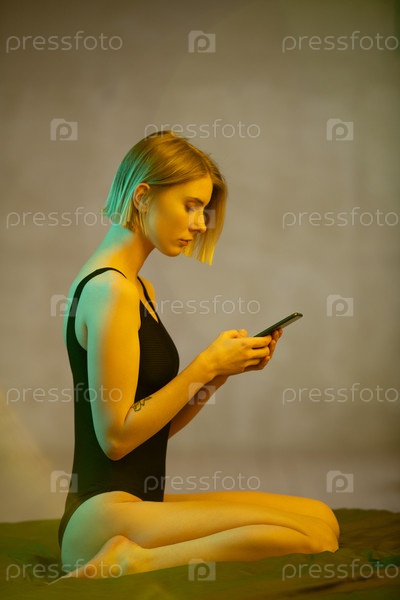 Боковой вид молодой блондинки серьезной женщины в черном трусе с помощью смартфона