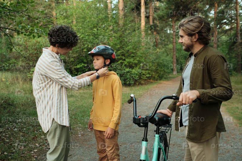 Молодая осторожная женщина помогает своему сыну привязывать ремни защитного шлема