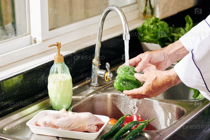 Зрелый человек промывает овощи
