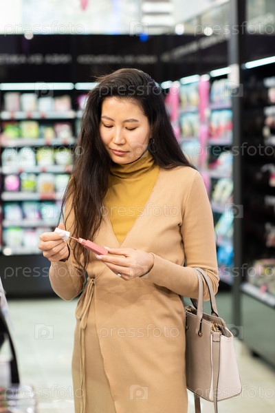 Молодая элегантная азиатская женщина с сумочкой выбирает новый блеск для губ в салоне красоты