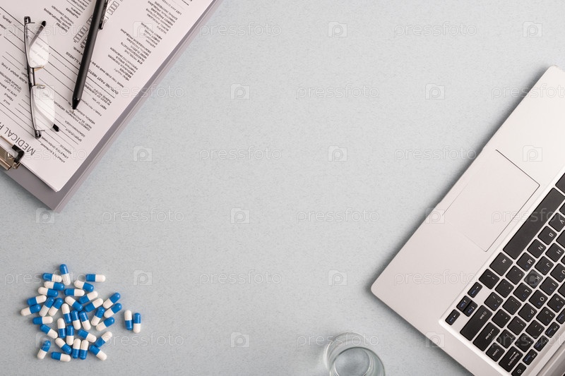 Вид сверху кописфера, окруженного кучей таблеток, ноутбука и других товаров