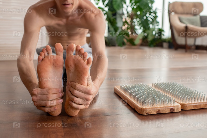 Без рубашки босоногий мужчина занимается на деревянном полу под подушками йога-терапии