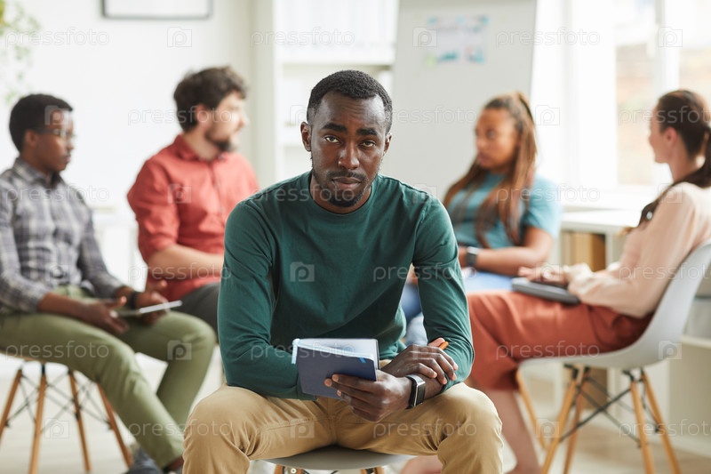Афроамериканский мужчина, стоящий лицом к камере на деловой встрече