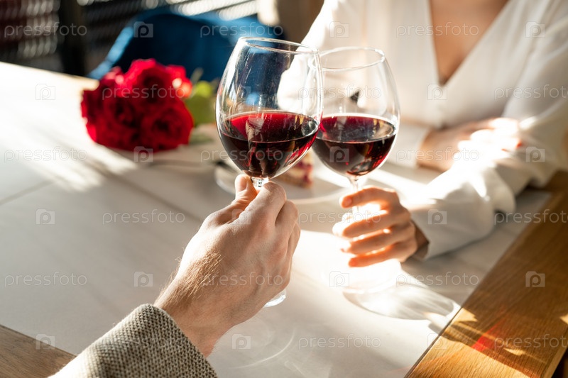 Руки молодого человека и женщины со стаканами красного вина над подаваемым столом