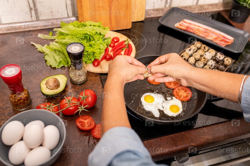 Руки молодой женщины ломают свежие перепелиные яйца на жаркой сковороде