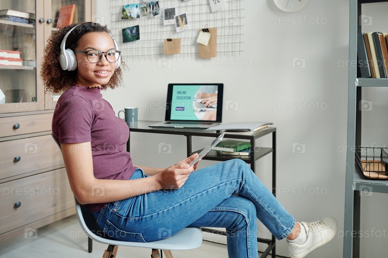 Веселая молодая женщина в повседневной одежде и наушниках, сидящая на ноутбуке