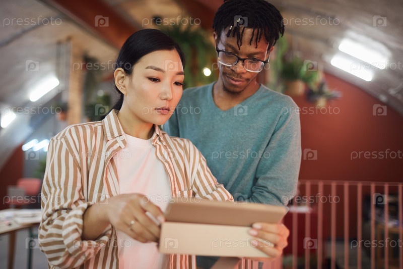 Бизнесмены из двух этнических групп используют цифровые планшеты