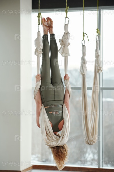 Обратный взгляд на активную молодую женщину, которая висит вверх ногами и держит белый гамак