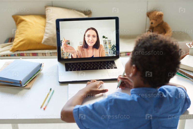 Вид сверху плеча черного мальчика, сидящего за столом и смотрящего на экран ноутбука во время подключения к онлайн-репетитору