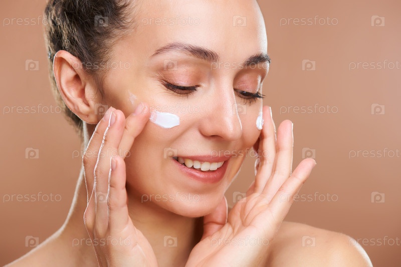 Молодая веселая женщина с зубчатой улыбкой наносит омолаживающий крем для лица