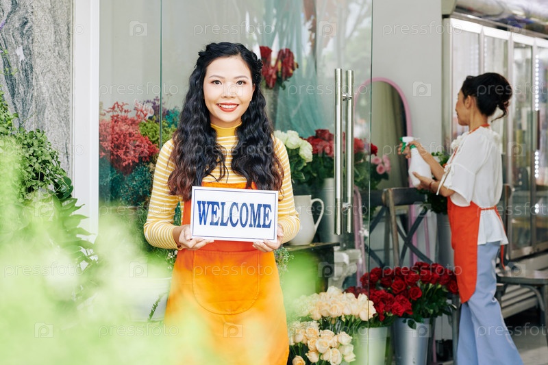 Владелец цветочного магазина приветствует клиентов