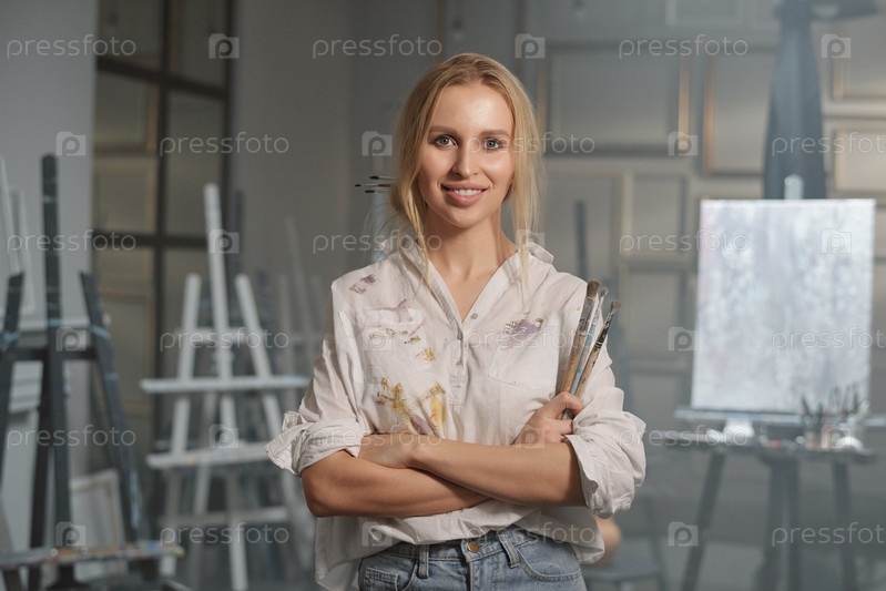 Молодая блондинка улыбается женщине в повседневной одежде, держа руки скрещенными на груди