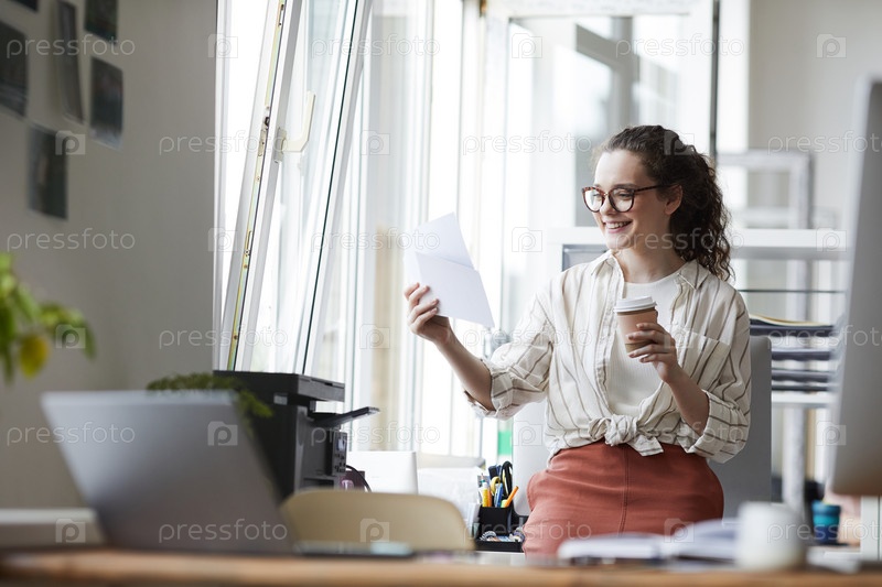 Улыбающаяся молодая женщина смотрит на фотографии в современном белом офисе