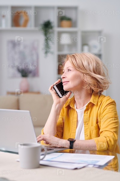 Успешная зрелая женщина-агент со смартфоном, звонящая одному из клиентов дома