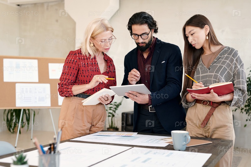 Две бизнес-женщины делают заметки и смотрят на дисплей планшета, который держит мужчина