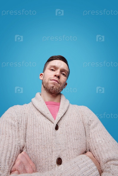 Красивый молодой человек в теплой шерстяной повседневной одежде смотрит на тебя в изоляции