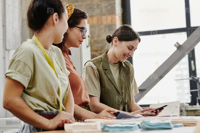 Счастливая молодая модная дизайнер с смартфоном показывает своим коллегам новые предметы