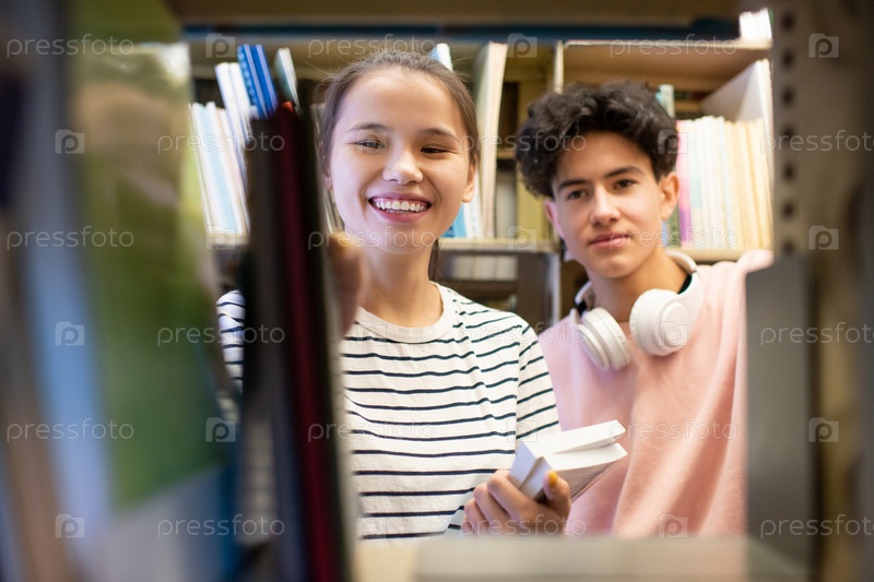 Веселая девочка-подросток и ее одноклассница стоят у книжной полки в библиотеке колледжа